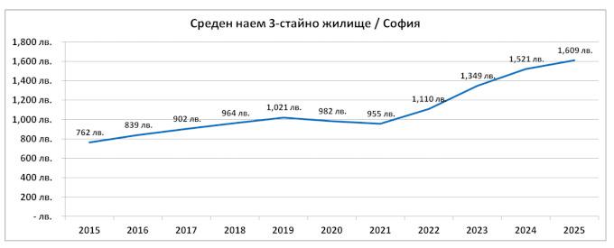Според данните на Имотека, брутната доходност от наем през 2015 г. в София е около 6%, докато през 2025 г. тя е 4% за Център и Лозенец, 4.8% за Кръстова вада, Манастирски ливади и Витоша, около 5% за Малинова долина, Младост, Надежда и Люлин.
